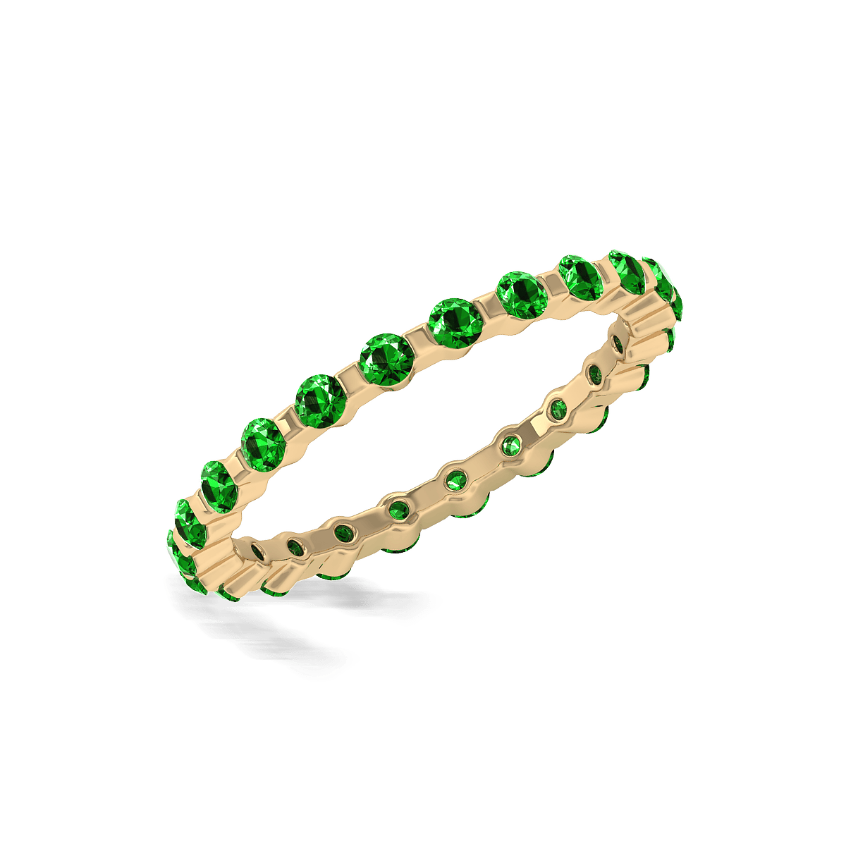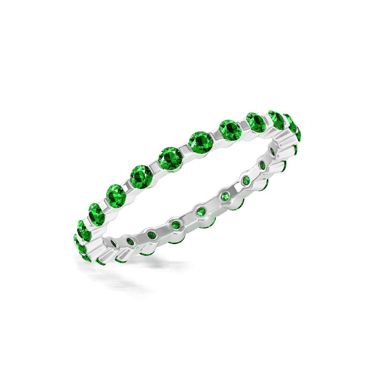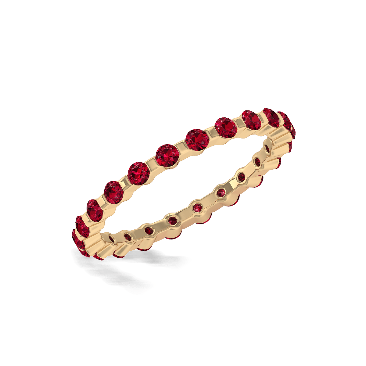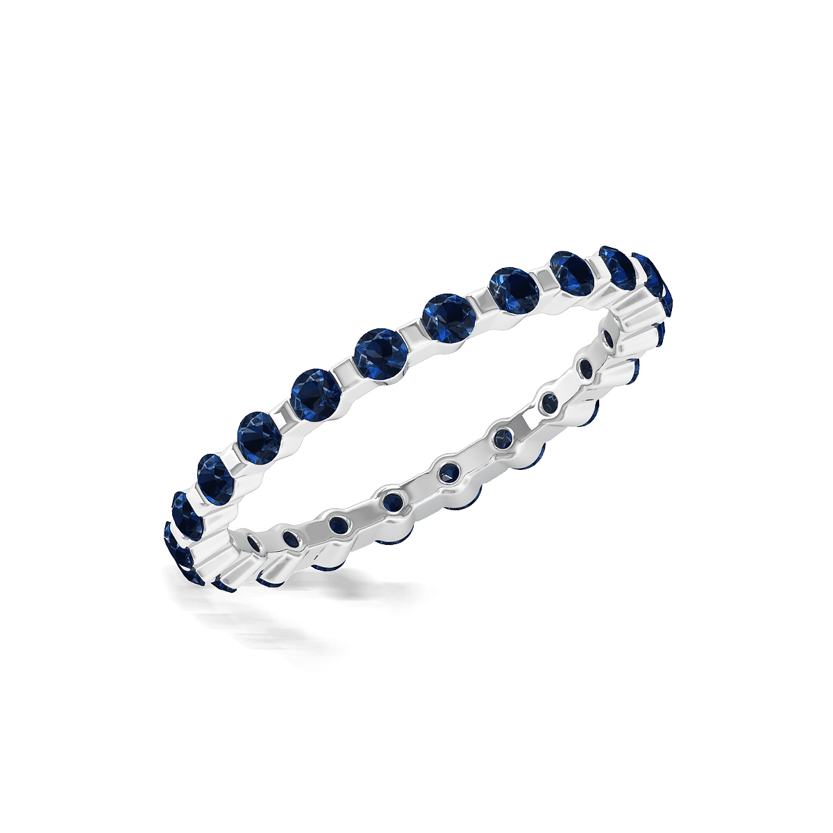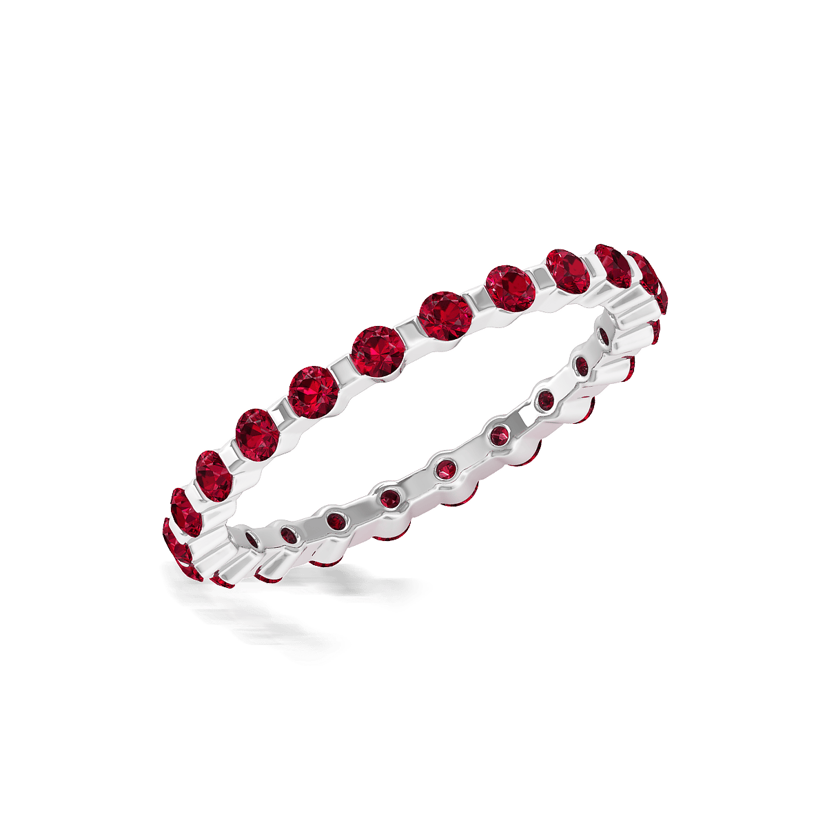 This design has a stylish shared prong with gemstones shimmer all the way around this delicate eternity style band for a spectacular look.