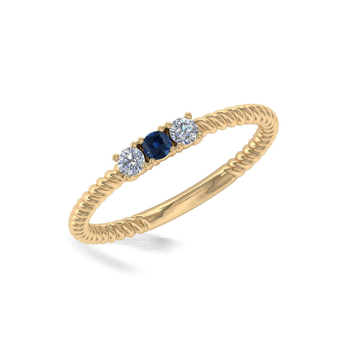 One of the iconic best selling three stone design with beautiful twirled gold band along the shank. The unique cut gemstones make this design a must have for everyone.
