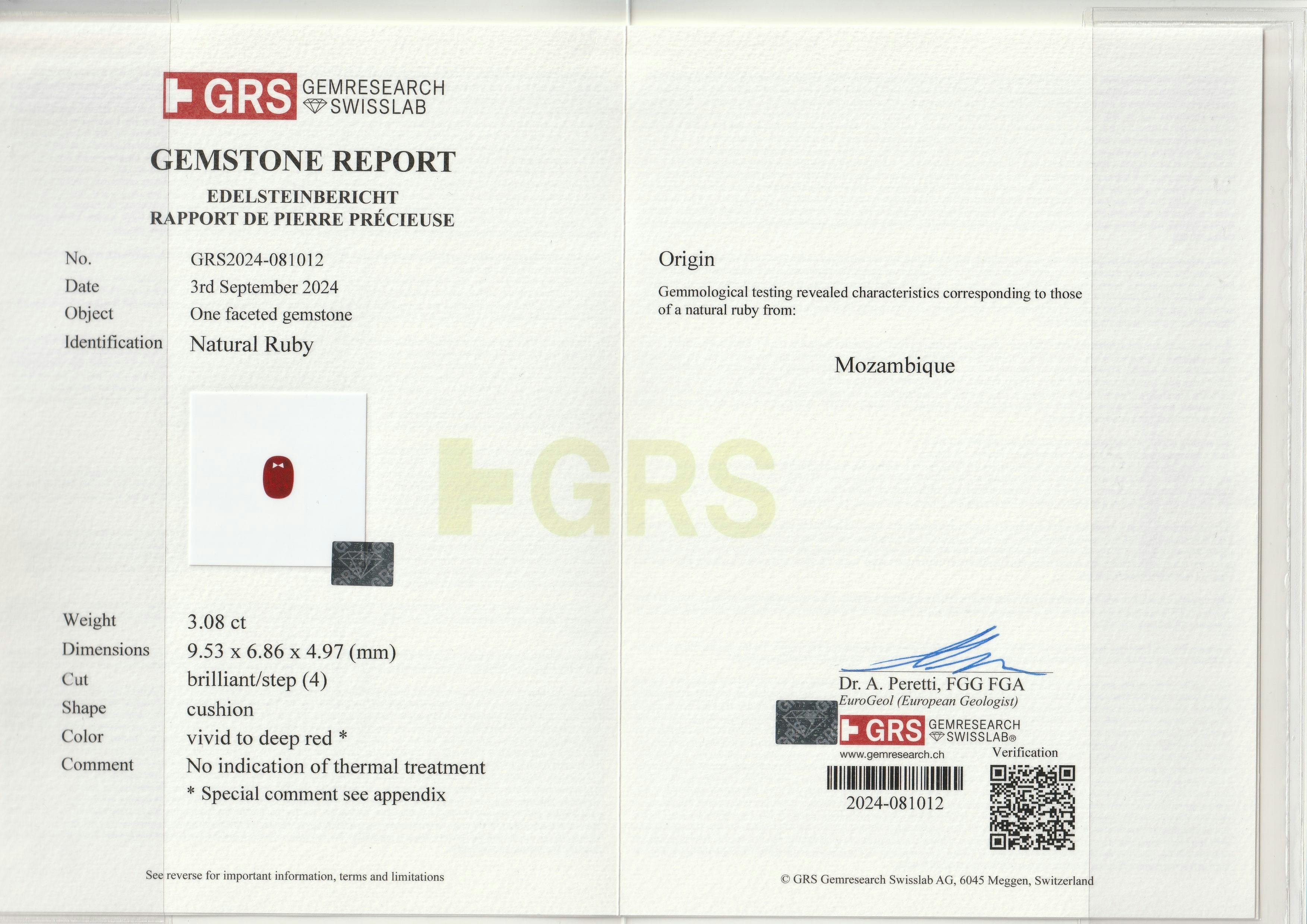 Loose Mozambique Ruby Gemstone GRS Certified Mozambique Ruby