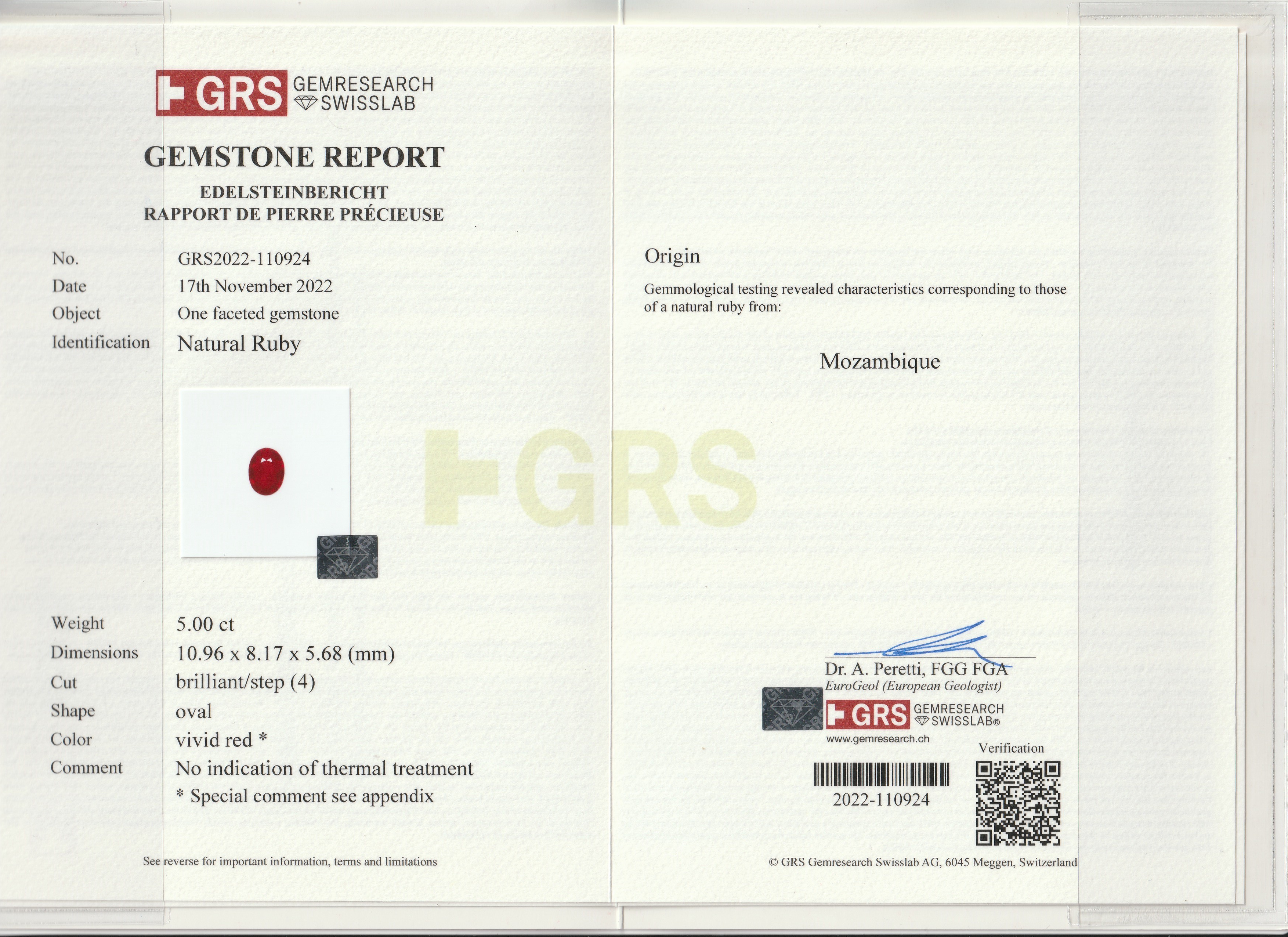 Loose Mozambique Ruby Gemstone GRS Certified Mozambique Ruby